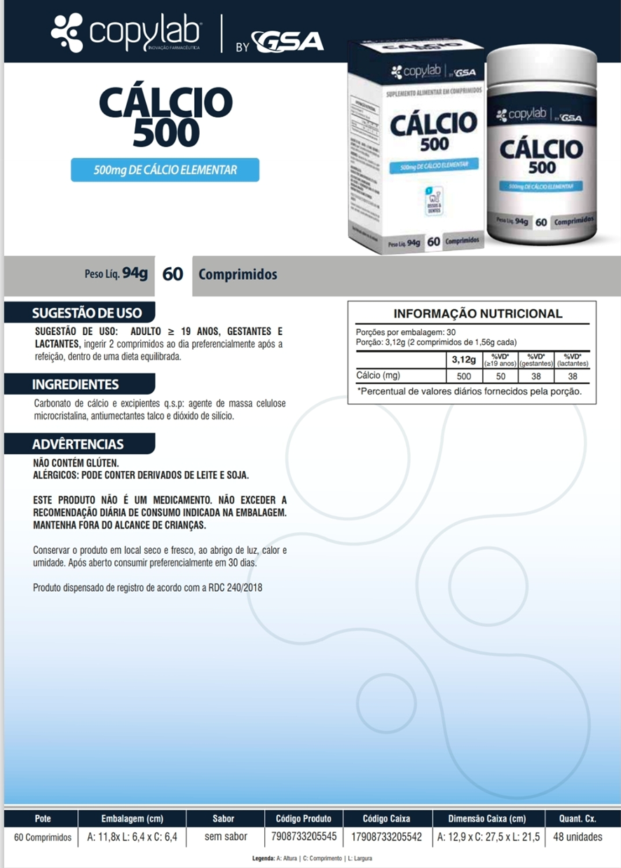 CÁLCIO 500 (500mg de Cálcio Elementar)